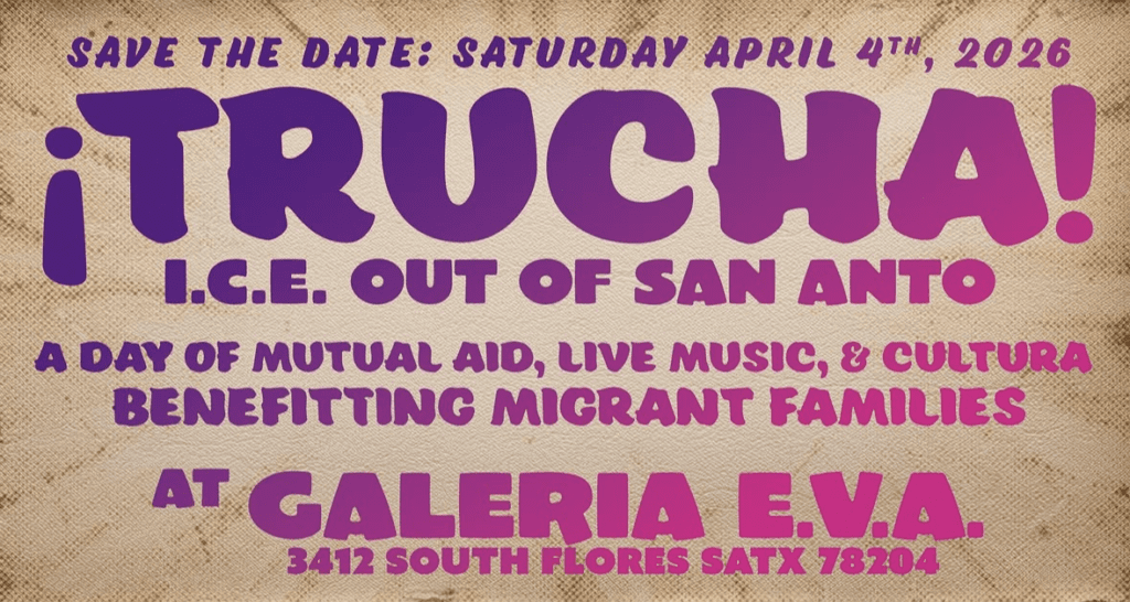 Join ACT 4 SA as we table to hand out resources and information to folks at Trucha:ICE Out of San Anto. A day of mutual aid, live music, and cultura to benefit migrant families. Hosted by Bombasta, Glowliners, Brown Berets Carnalismo, and more! And support the cause and have fun while you’re out there too. $15 donation suggested but no one turned away due to lack of funds.